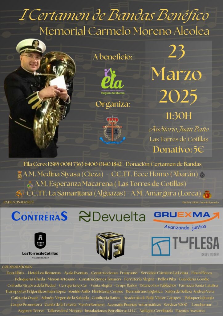 El próximo 23 de marzo de 2025 a las 11:30 h, el Auditorio Juan Baño en Las Torres de Cotillas será el escenario de un evento solidario en honor a Carmelo Moreno Alcolea. Un certamen en el que la música se une a la lucha contra la ELA, recaudando fondos para la Asociación ELA Región de Murcia.